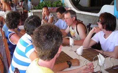 Après le retour des plongées sous un soleil ardent, vite, un petit rinçage et nous nous retrouvons tous au restaurant donnant sur la plage et la mer turquoise. L’intendance « resto » est parfaite…