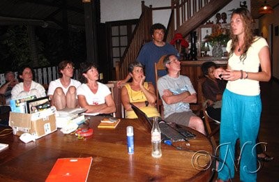 …Les photos sont chargées sur les ordinateurs portables puis nommées, genre, espèces, photographe, lieu de la prise de vue… Le vidéoprojecteur en place, un grand drap tendu sur un mur et c’est parti pour un petit cours sur les poissons.