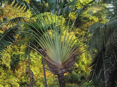 L’arbre du voyageur ou « ravenala », prononcer [ravnal], c’est son nom malgache qui est devenu aussi son nom latin car il est endémique de Madagascar, doit son nom à sa faculté qu’il a d’emmmagasiner l’eau à la base de ses feuilles, ce qui permet au voyageur assoiffé de se désaltérer. Cependant, d’un point de vue sanitaire, je vous le déconseille fortement….Virus, bactéries et parasites s’en donnent à cœur joie dans cette eau stagnante à 30°C.
