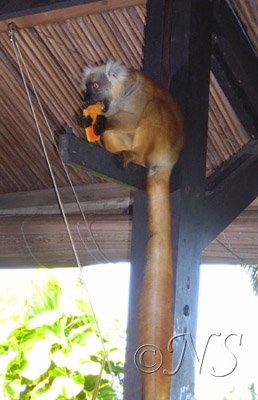 De temps en temps, les arbres s’agitent fortement, signant l’arrivée des makis qui, curieux viennent voir ces nouveaux touristes et éventuellement les fruits qu’ils auraient pu oublier sur les tables…Il est déconseillé de nourrir les animaux en liberté. Ils possèdent de grands yeux roux, une belle fourrure et une longue queue. Ils sautent d’arbre en arbre les bras en l’air. Ces grands sauts sont impressionant.
