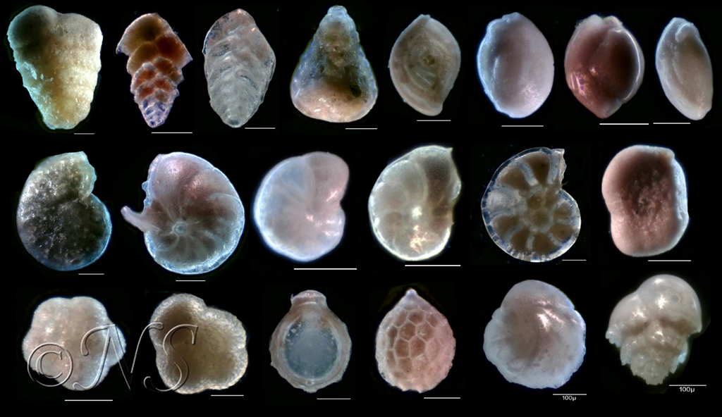 Les foraminifères sont des des microorganismes unicellulaires, des Protozoaires. Ils sont principalement marins et fabriquent un test calcaire formé de plusieurs loges dans une grande majorité. Les loges communiquent entre elles par des ouvertures (d’où le nom de foraminifères, dérivé du latin foramen, trou). Le cytoplasme ( la partie vivante) sort par une ou plusieurs grandes ouvertures et recouvre complètement le test. Les extensions du cytoplasme,, souvent des pseudopodes, sont utilisées pour se déplacer et pour se nourrir.