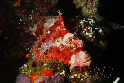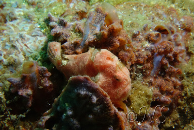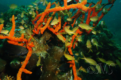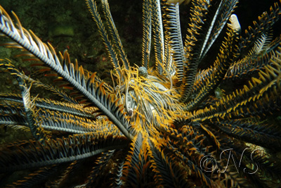 Les comatules sont nombreuses avec parfois une crevette à l’intérieur. Des éponges barriques sont souvent peuplées de petites holothuries blanches. Dans les creux de ces éponges barriques, des galathées de Walii « grosses » de 1 cm, poilues, roses et voilette se cachent. Il n’y a que la lampe qui permet de les observer.