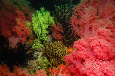 Néanmoins, de grands alcyonaires, ces coraux mous oranges, roses, rouges, de nombreuses comatules colorées et des buissons de coraux noir, de nombreuses anémones avec des poissons clowns et de belles crevettes transparentes bleues et roses promettent de belles photos.
