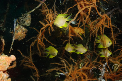 De grands bancs d’Anthias rouges sont présents près du récif, mérous, poissons papillons, poissons perroquet, quelques poissons anges. Les poissons sont fuyants, pas comme en Mer rouge ou aux Maldives. Ils sont plus difficile à observer et à photographier…