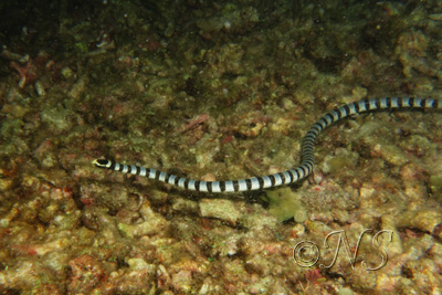Nous avons croisé plusieurs fois des serpents de mer, Laticauda laticauda à cause de sa queue aplatie qui l’aide à nager. Le tricot rayé a une morsure mortelle mais sa tête est très petite et il n’est pas agressif. Je me tiens tout de même à distance…