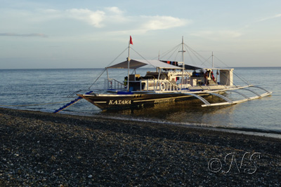 Le bateau est une barka, un bateau philippin typique avec des flotteurs de chaque côté qui lui donnent une grande stabilité. Il a de plus un très faible tirant d’eau, gros avantage dans ces eaux aux nombreux récifs par rapport aux gros bateaux de croisière « classiques » comme en Mer rouge par exemple.