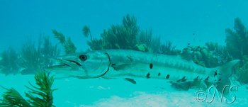 Sur le fond de sable, sur une profondeur de 4 mètres, nous avons croisé un grand barracuda territorial qui nous a dit (traduction de son regard direct…) : ici, c’est mon territoire, fait un détour! Donc, nous avons fait un détour…