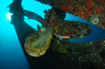 Lors d’une autre plongée bateau, nous avons visité une épave. L’hélice est très coloré par les éponges.