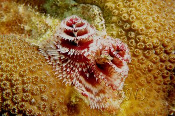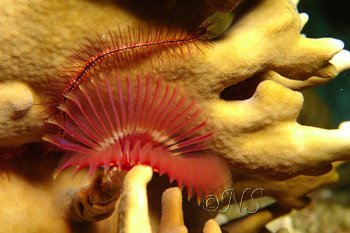 Les coraux du genre Porites sont très souvent peuplés de vers spirobranches qui étalent leur panaches de branchies très colorés, un régal pour les photographes. On peut les approcher assez près sans qu’ils rentrent leurs panaches.