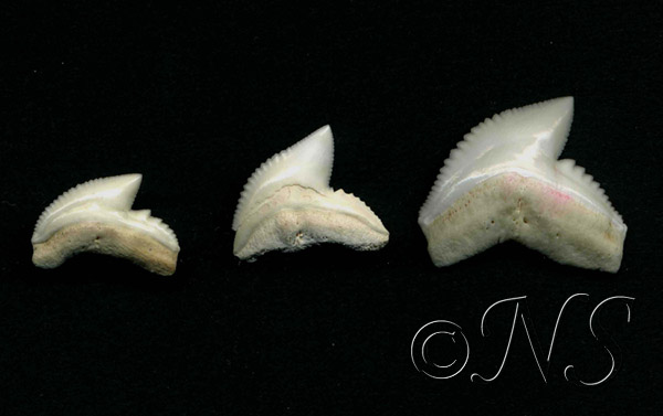 Certaines des dents de requin possèdent à leur base de part et d’autre deux forts denticules. C’est le cas du requin marteau qui se nourrit aussi de poissons et de céphalopodes.