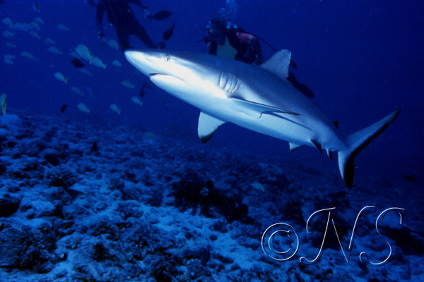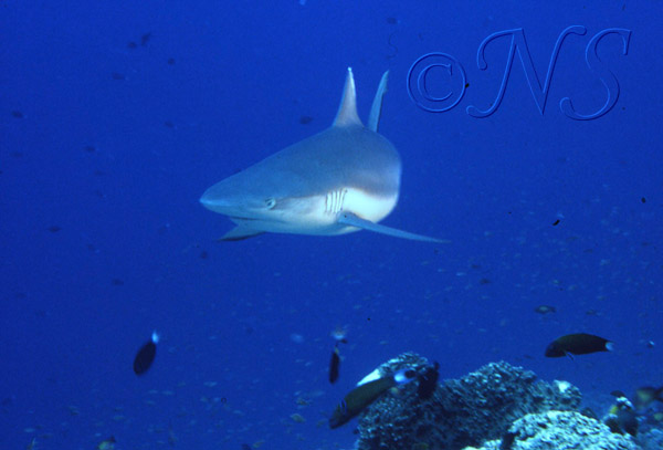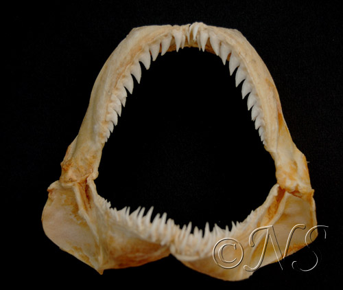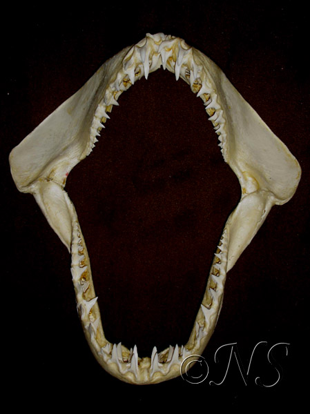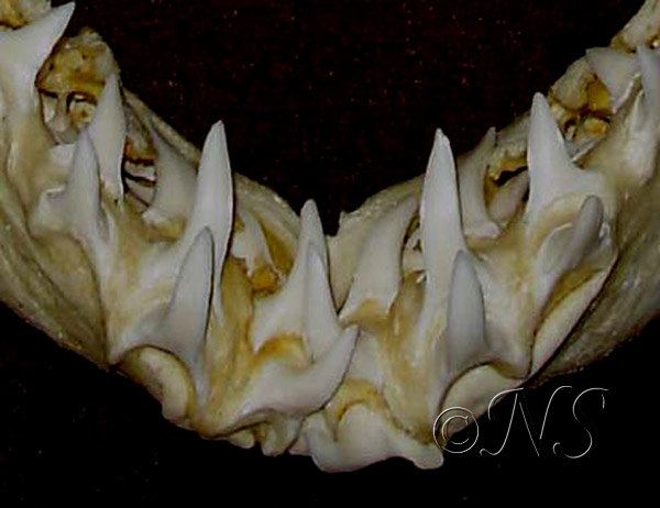 Le requin tigre (Galeocerdo cuvier) possède des dents particulières, subtriangulaires, plates et fortement crénelées. Cela lui permet aussi bien de découper les carapaces de tortues que d’arracher des portions de chair à des proies de grande taille comme d’autres requins ou des mammifères marins. Je n’en ai pas vu en plongée. Je n’ai pas envie d’en rencontrer…