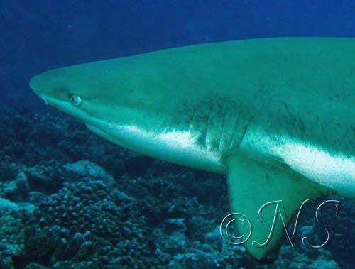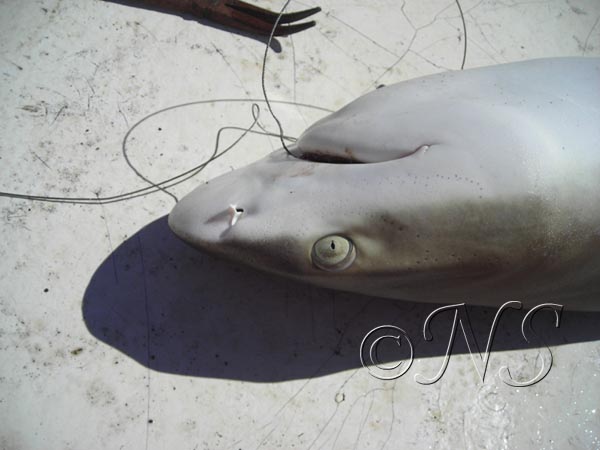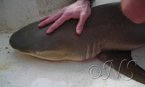 C’est une femelle. Une fois sur le bateau, elle est immobilisée, l’un des équipiers la maintient par la main fermement appuyée sur sa tête. La peau du requin est particulièrement rugueuse. Elle est constituée de milliers de denticules placés de manière à minimiser les effets des courants qui facilitent la pénétration du requin dans l’eau et diminue la résistance de l’eau.