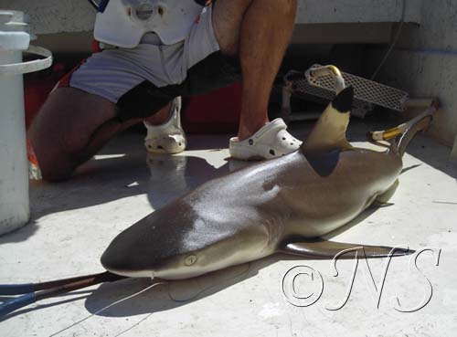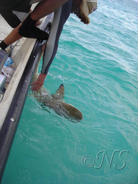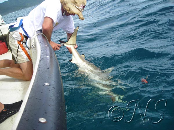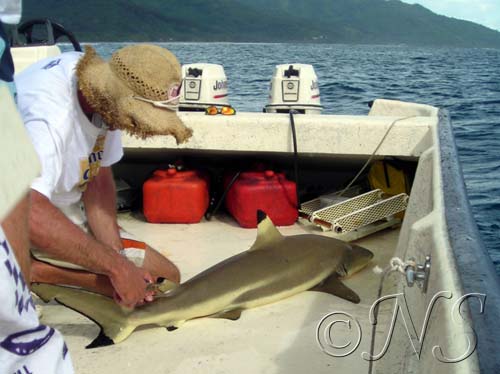 Ils peuvent être pêchés du bord, ceci pour les petits requins qui s’approchent près de l’île. Ils peuvent être pêchés en bateau pour les plus gros. Enfin, la pose d’émetteur peut se faire directement dans l’eau en plongée mais cela, c’est affaire de gens expérimentés. certains apnéistes parviennent à le faire.