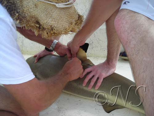 Il perce deux trous dans la nageoire dorsale à l’aide d’un tournevis. Pas de réaction de l’animal qui ne doit rien sentir sur sa nageoire cartilagineuse. L’émetteur est solidement fixé.