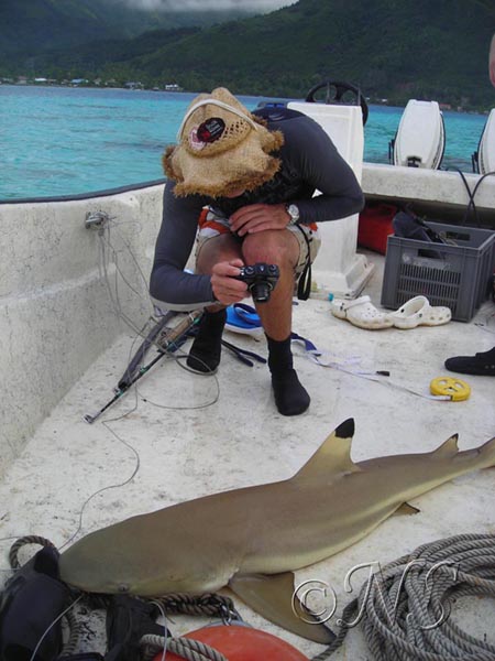 L’un de ses objectifs est de marquer les requins pointes noires et les requins citrons avec un émetteur afin de connaitre leurs déplacements autour de l’île.