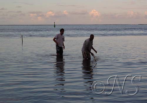 Nous partons ce soir pour une petite plage sur la côte nord de Moorea pour la pêche au requin du bord. Il y a un faible courant. Dans 50 centimètres d’eau, Johann mouille le filet, large de 5 mètres environ. Il retiendra les requins lors de leur passage.