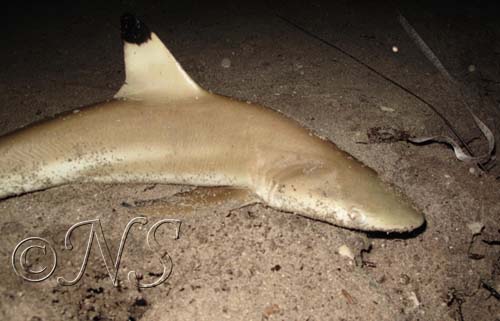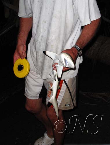 Ça y est, quelques vaguelettes reflètent une présence. Un petit requin est venu se coincer dans le filet. Johann le saisi par la queue et le détache.
