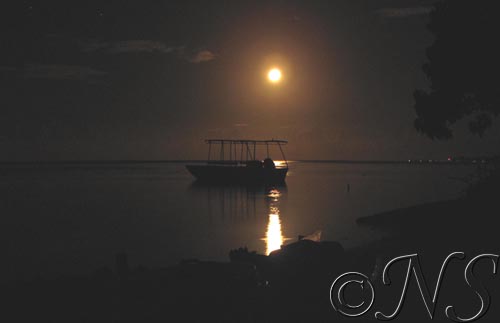La lune se lève. C’est la pleine lune et sous ce nouvel éclairage, les étoiles semblent disparaître. Les reflets dans l’eau calme, donnent une grande sérénité à ce paysage déjà magique. Le petit bateau de pêche se mire dans ce miroir sous l’éclat de la pleine lune.