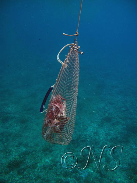 Un appât est mis à l’eau du côté face au courant de sorte que l’odeur dégagée se répand de l’autre côté du filet. En remontant le courant, les requins rencontreront le filet avant l’appât. Cet appât est constitué de poissons morts dans un sac en grillage métallique.