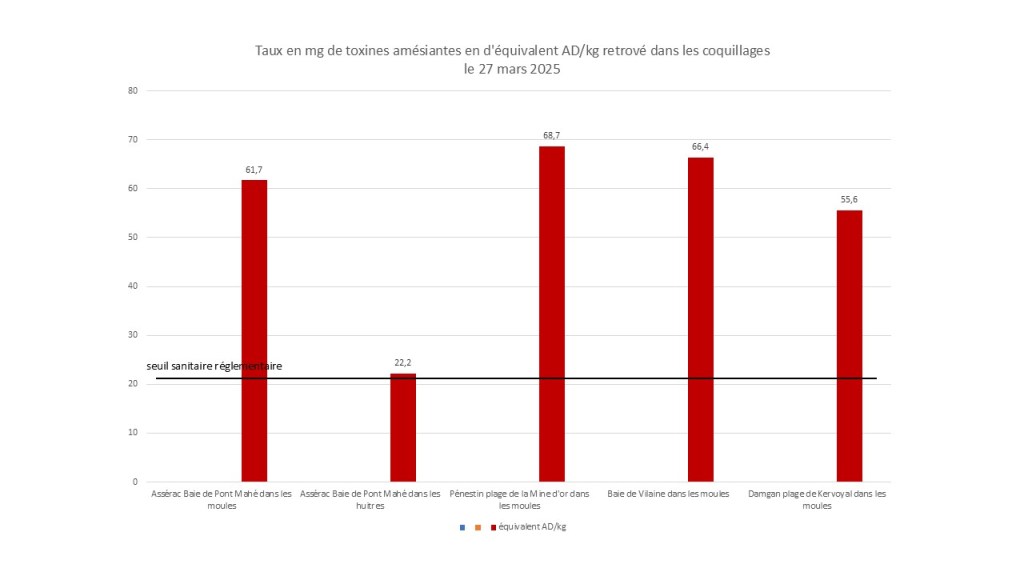 Ce graphique montre le taux de toxines amnésiantes retrouvées dans les coquillages, Le seuil fixé par la réglementation est de 20µ par g de chair de coquillage. Le 27 mars 2025, dtae des prélèvements, ce taux était largement dépassé