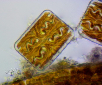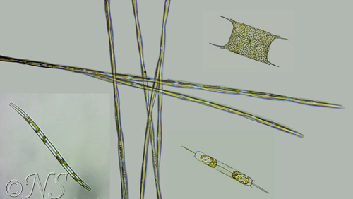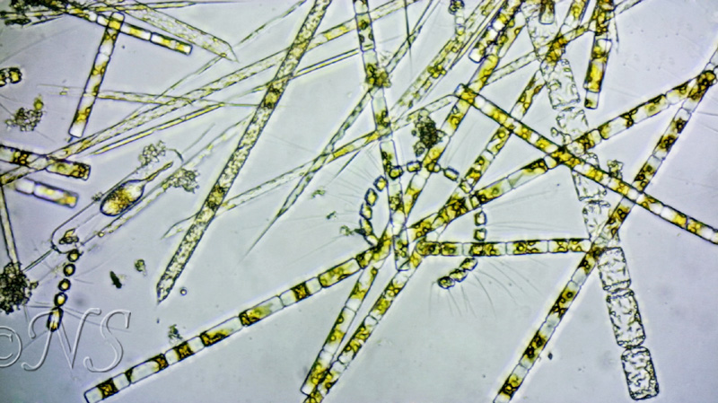 Prélèvement à Damgan en mai 2025 montrant une concentration importante de diatomées filamenteuses :