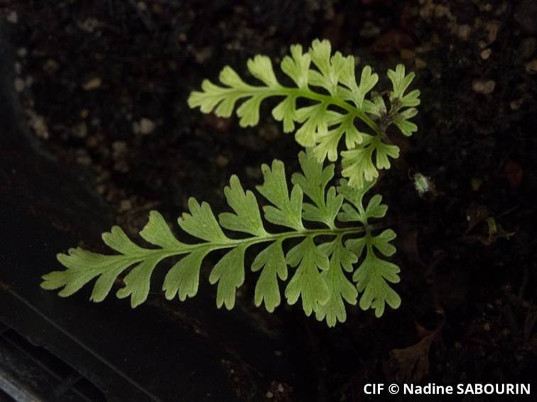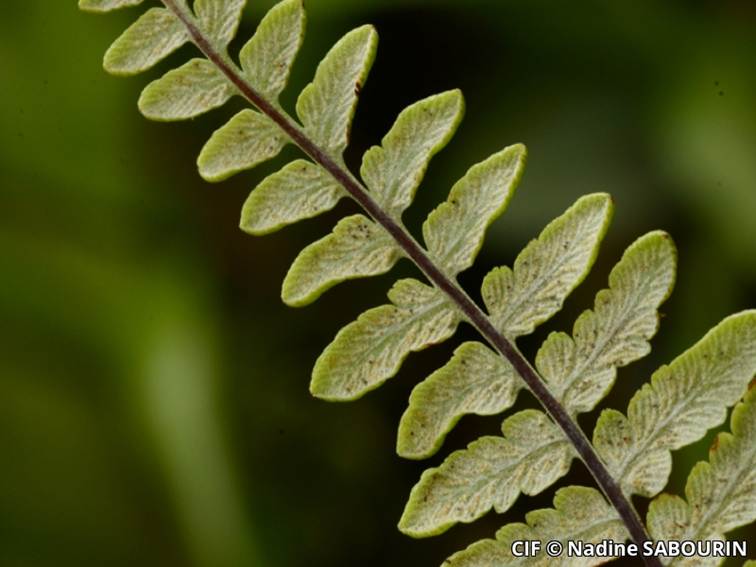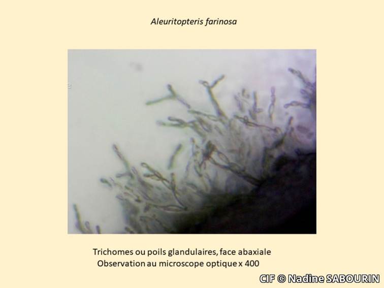 Trichomes ou poils glandulaires sur la face abaxiale des frondes qui donnent la couleur blanchâtre caractéristique.